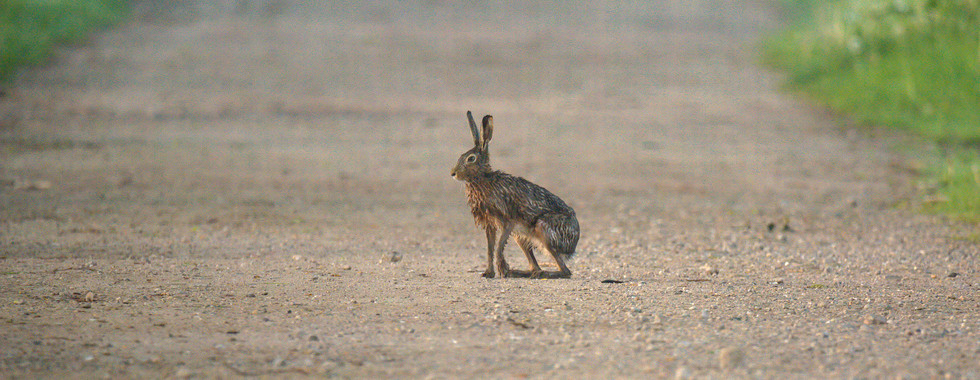 Al na 50 meter wandelen horen we, naast alle overvliegende zwaluwen, een eerste koekoek roepen. Verderop, hoog in een boom, zien we een gestalte die erg lijkt op een koekoek. Wanneer hij een paar tellen later weg vliegt, weten we het zeker. We lopen rechtsaf een pad in. De lente is hier duidelijk een paar weken verder gevorderd dan de laatste keer dat we hier liepen. De bomen zijn groener, in de sloot links begint het riet al te groeien. De kleine karekieten weten dat ook, om de 100m horen we er een zingen om zijn territorium af te bakenen. Aan het einde van het pad slaan we linksaf een brede, onverharde weg in. Deze weg wordt aan beide zijden geflankeerd door een lange rij hoge bomen. Ik vermoed dat het populieren zijn. Ook hier is het zicht en het licht geweldig mooi en dus leg ik het weer vast met mijn telefoon. Links staan twee koeien in een wei naast een sloot, hun uitademen zorgt voor wolken in de lucht. Hollandser kan het niet. Nick is ondertussen met Bolt wat verder gelopen en fluistert mijn naam. Snel kijk ik zijn kant op en meteen zie ik waarom hij roept. Op het pad komt een haas recht op ons af rennen. Door mijn lens kijkend zie ik dat de haas zeiknat is van het natte gras. Het is een beetje een gek gezicht, zo'n natte haas met zijn schriele poten.